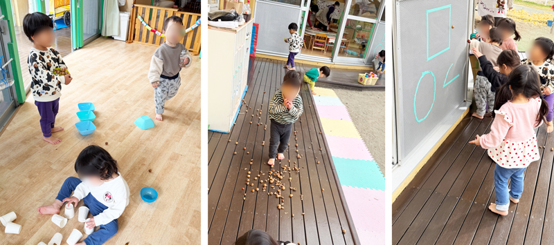 1歳児クラスでは、子どもの興味を軸に環境を構成しています。季節や行事を取り入れながらも、子ども自身の気づきや関心を大切にし、保育者が共に関わります。例えば、テラスのマットから飛び出さない姿や、どんぐりを口に入れなくなる姿は、単なる約束の理解ではなく、遊びの経験を通して自ら判断する力が育っている表れです。テラスから飛び出すことよりも、素材や人との関わりの中に楽しさを見出していることの表れでもあります。最初は口に入れて確かめていた素材も、経験の積み重ねによって「食べるもの」から「遊ぶもの」へと意味づけが変化していきます。曖昧さを含んだ移ろいゆく遊びを支える多様な環境や十分な量の保障が、遊び込みを支えています。