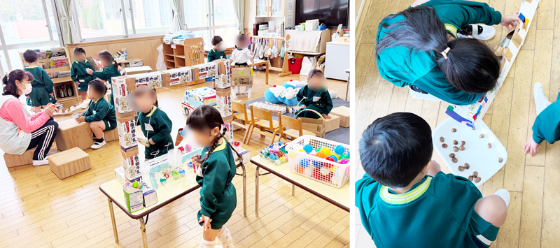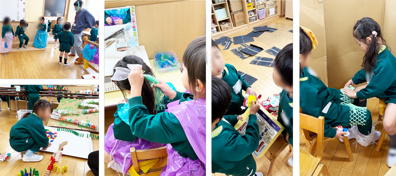 4歳児では、テーマを共有しながらも個々の思いを大切にする姿が見られます。自分の考えを表現することと同時に、異なる価値観を受け入れる寛容さが育まれていきます。室内遊びにおいても、興味や関わりの深い素材、友達との思いの共有をもとに、それぞれが遊びを深めていました。これまで一人ひとりの思いを受け止められてきた経験が、他者を尊重する姿勢へとつながっています。