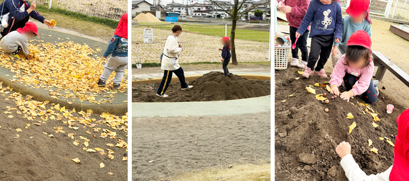 今回は土の山でバースデーケーキを作っていましたが、普段は別の遊びをしています。今回はイチョウの葉のプールができたことと関連しているようです。おそらく誕生日会の経験から、バースデーケーキという発想につながったのではないかと思います。