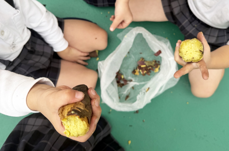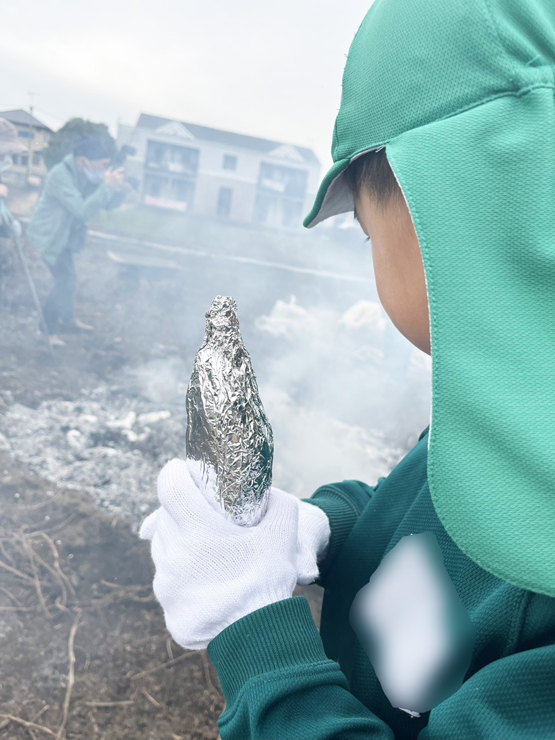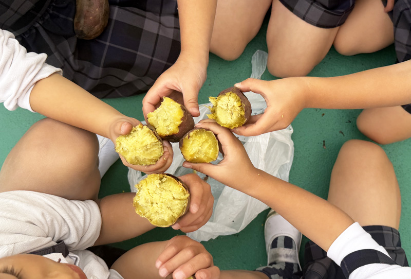 ホームすくすく子育て支援センター R7.11.13 焼き芋 2025年11月13日 こども園の畑で育てたサツマイモを使って焼き芋をしました。 年長児と年少児が手をつないで畑へ きょうの午後のおやつは焼き芋 焼き芋でかんぱい!「今日もいちにちがんばろうね!」とのこと 「それ やきいもまとめて グーチーパー」