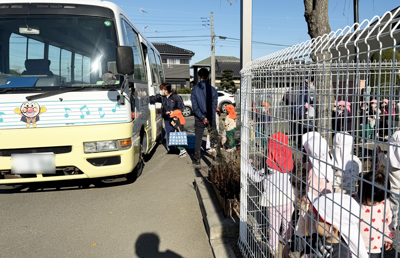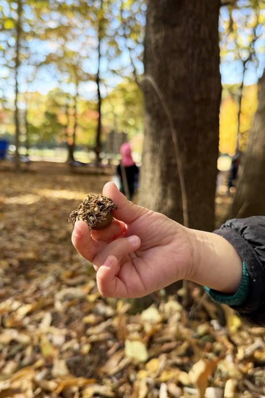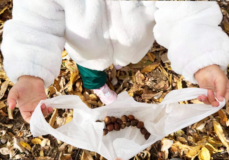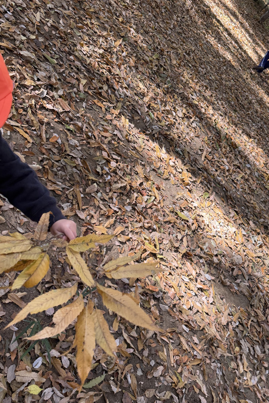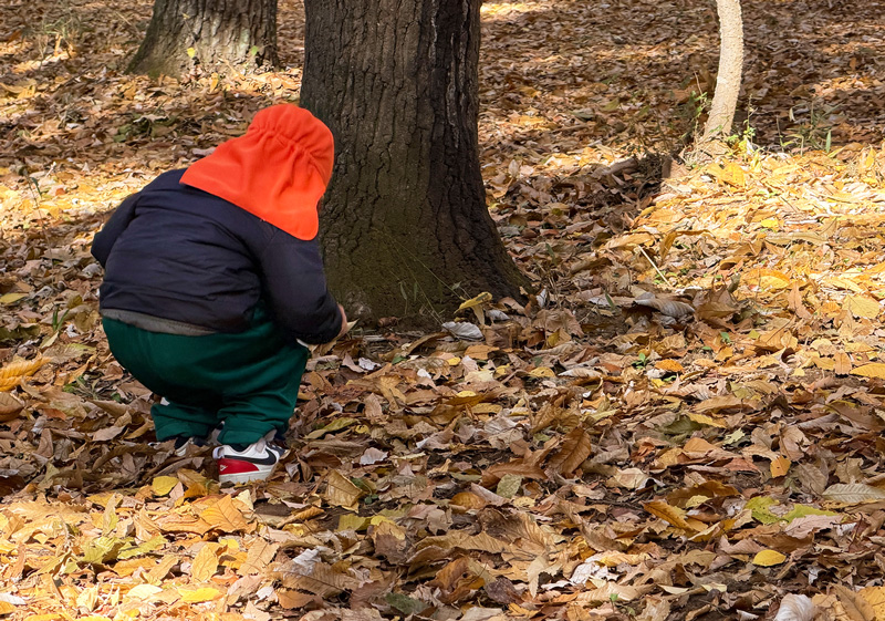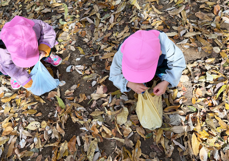 ホームもも組 R7.11.19 3歳(年少児)遠足 2025年11月20日 五郎助山に遠足に行ってきました。 0・1歳児に見送られながら出発 到着するとたくさんのどんぐりを見つけて拾い出しました。 「髪の毛が生えているみたい」 バッタを見つけて
